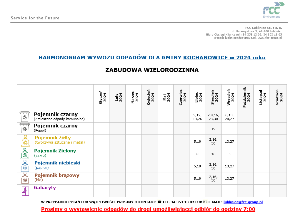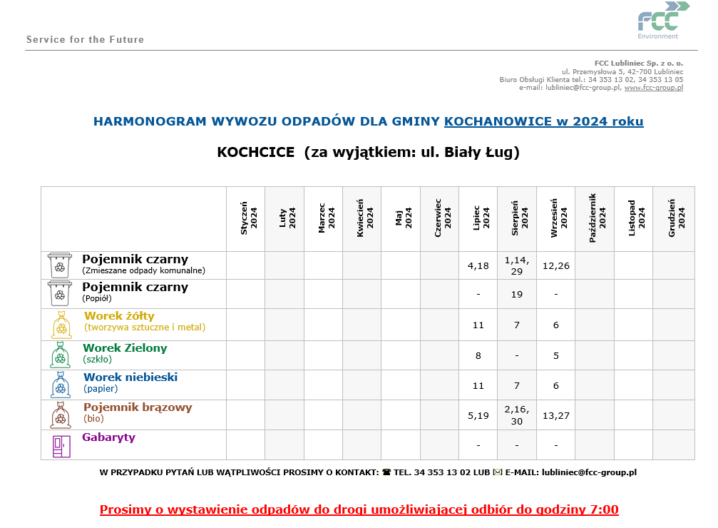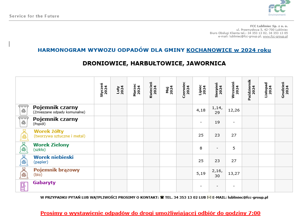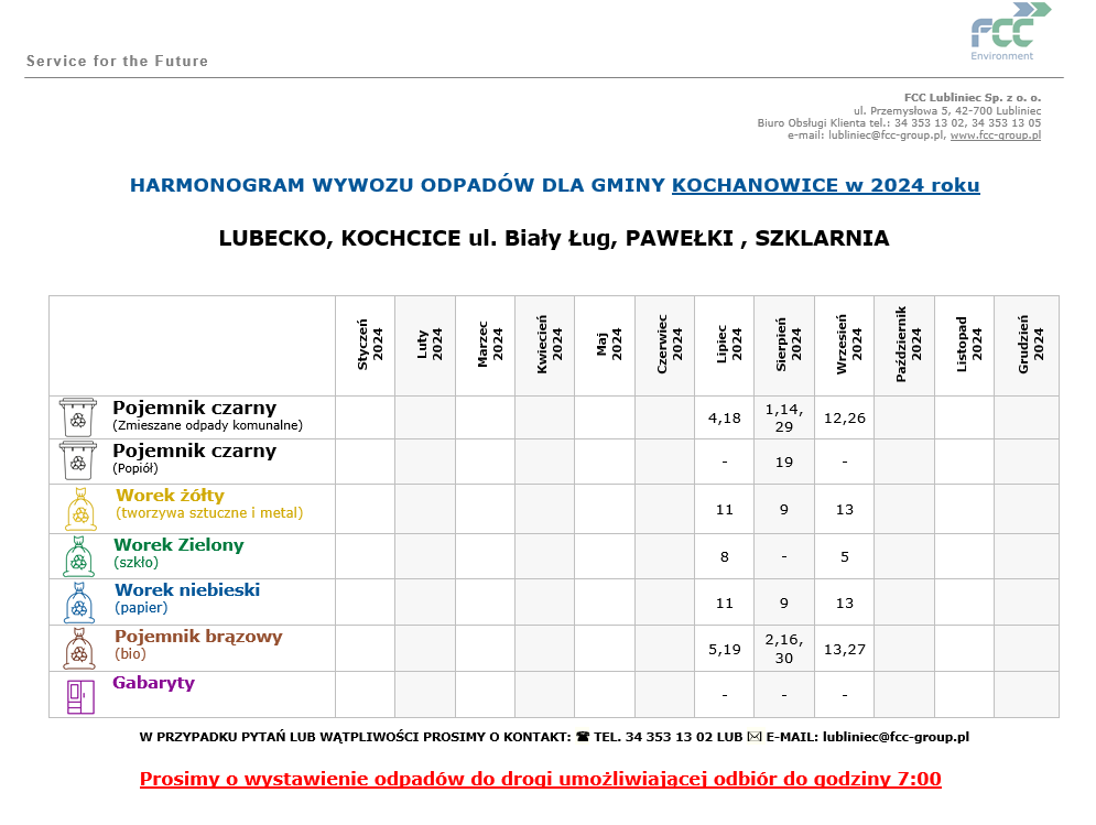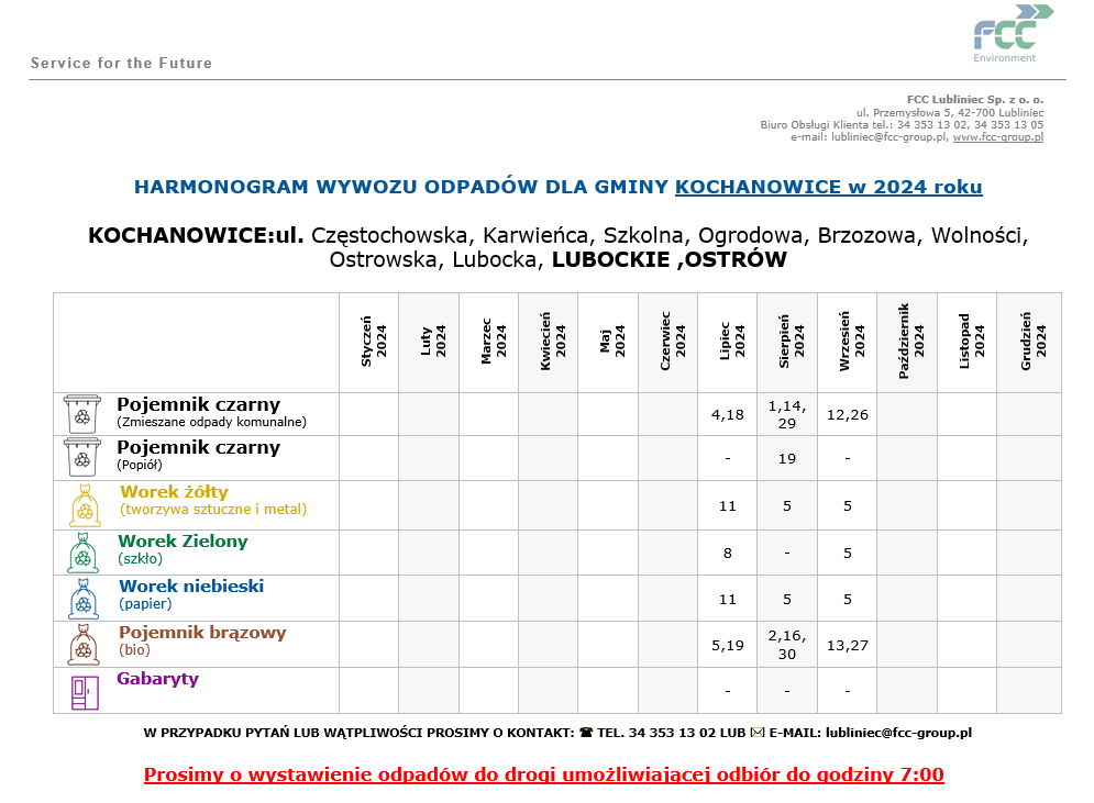 Harmonogram odbioru odpadów w okresie lipiec – wrzesień 2024 r.