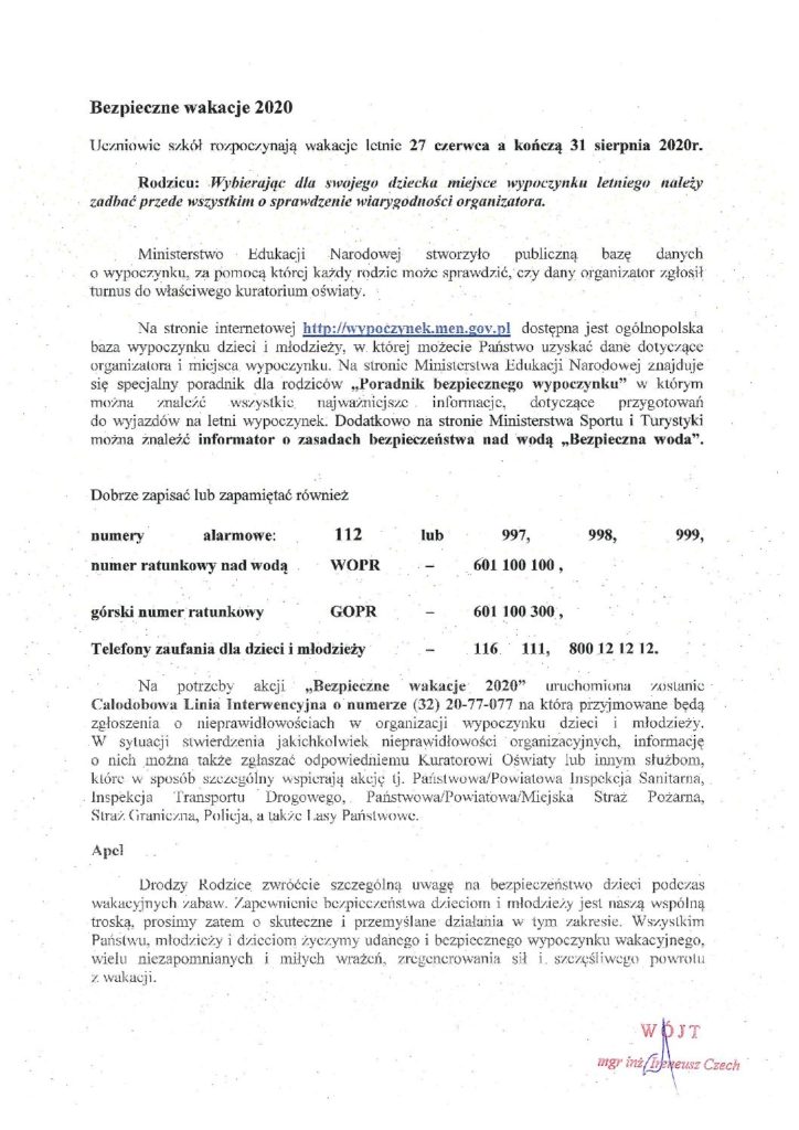 Drodzy Rodzice zwróćcie szczególną uwagę na bezpieczeństwo dzieci podczas wakacyjnych zabaw. Zapewnienie bezpieczeństwa dzieciom i młodzieży jest naszą wspólną troską, prosimy zatem o skuteczne i przemyślane działania w tym zakresie. Wszystkim Państwu, młodzieży i dzieciom życzymy udanego i bezpiecznego wypoczynku wakacyjnego, wielu niezapomnianych i miłych wrażeń, zregenerowania sił i szczęśliwego powrotu