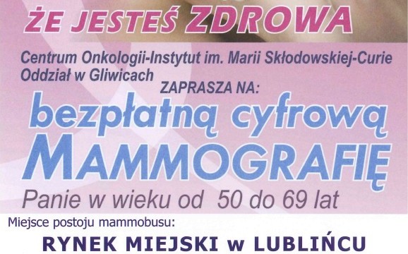 Centrum Onkologii-Instytut im. Marii Skłodowskiej-Curie, Oddział w Gliwicach zaprasza na bezpłatną cyfrową mammografię Panie w wieku od 50 do 69 lat.