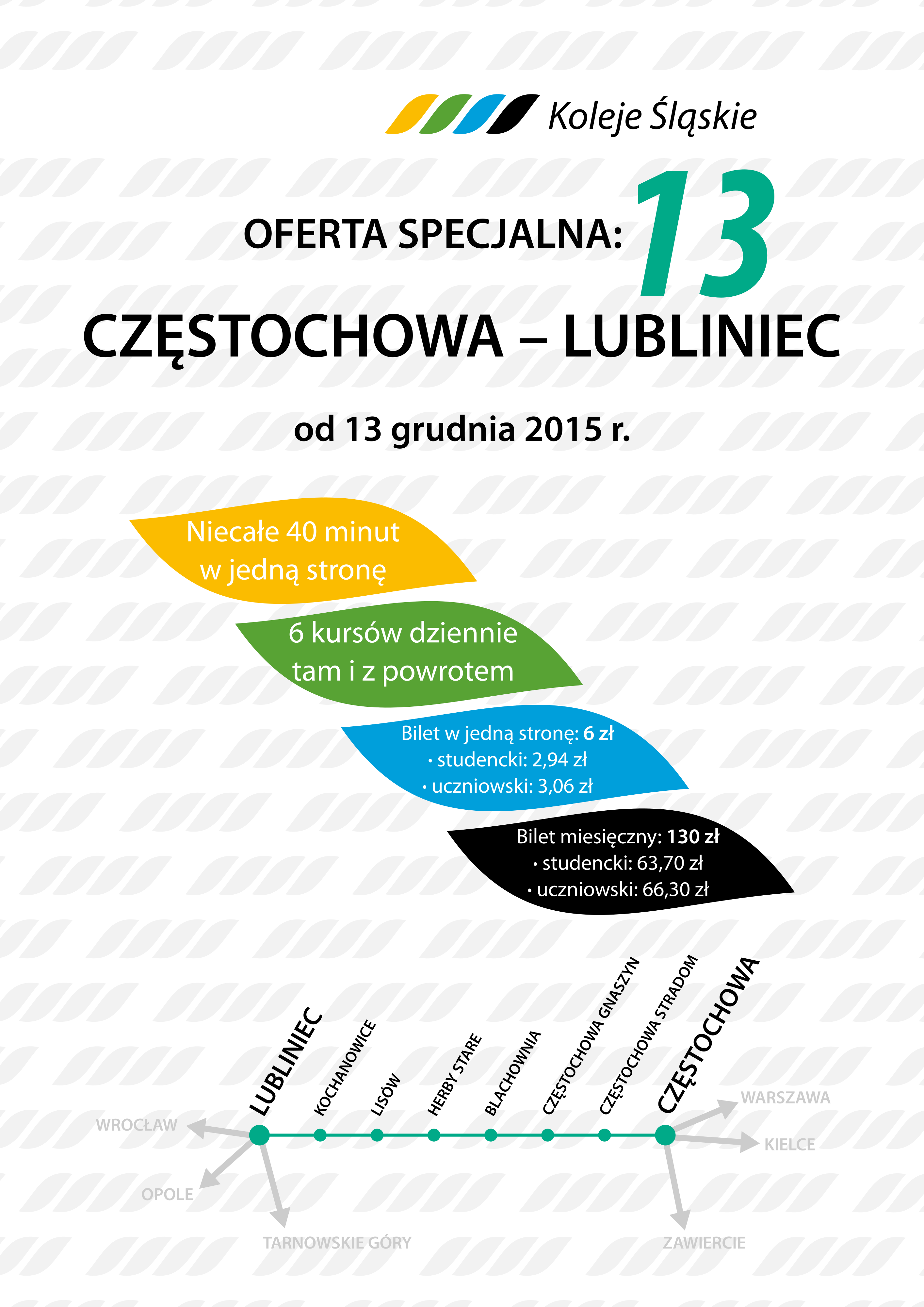 23 grudnia 2015 - Aktualności, Dla mieszkańców, Dla przedsiębiorców, Dla turystówSzanowni Państwo, Od 13 grudnia wdrożono nowy rozkład jazdy pociągów. Wraz z tym, z myślą o mieszkańcach północnej części województwa śląskiego, nie tylko przywrócono połączenia kolejowe na trasie Lubliniec – Częstochowa, ale także wprowadzono nową ofertę promocyjną. Może ona zainteresować…