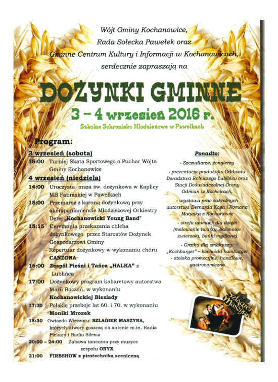 30 sierpnia 2016 - Aktualności, Dla mieszkańców, Dla turystów, KulturaWójt Gminy Kochanowice, Rada Sołecka Pawełek oraz Gminne Centrum Kultury i Informacji w Kochanowicach serdecznie zapraszają na: Dożynki Gminne 3-4 września 2016 r. Szkolne Schronisko Młodzieżowe w Pawełkach Program: …