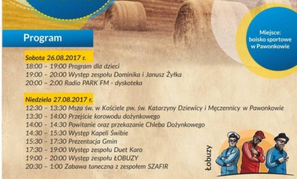 Dożynki powiatowe 2017 odbędą się w dniach 26-27 sierpnia. Impreza rozpocznie się w sobotę o godz. 18 programem dla dzieci. O godz. 19 wystąpią Dominika i Janusz Żyłka, a o godz. 20 rozpocznie się dyskoteka z Radio PARK FM.