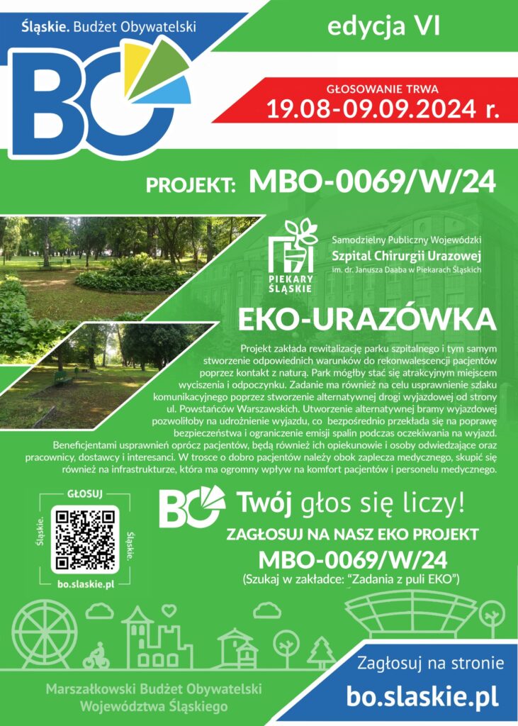 W imieniu swoim oraz Dyrekcji Samodzielnego Publicznego Wojewódzkiego Szpitala Chirurgii Urazowej im. dr. Janusza Daaba w Piekarach Śląskich Gmina Kochanowice zwraca się z prośbą o pomoc w głosowaniu w ramach VI edycji Marszałkowskiego Budżetu Obywatelskiego Województwa Śląskiego. Projekt „EKO-URAZÓWKA” został zarejestrowany pod nr MBO-0069/W/24 w puli EKO.