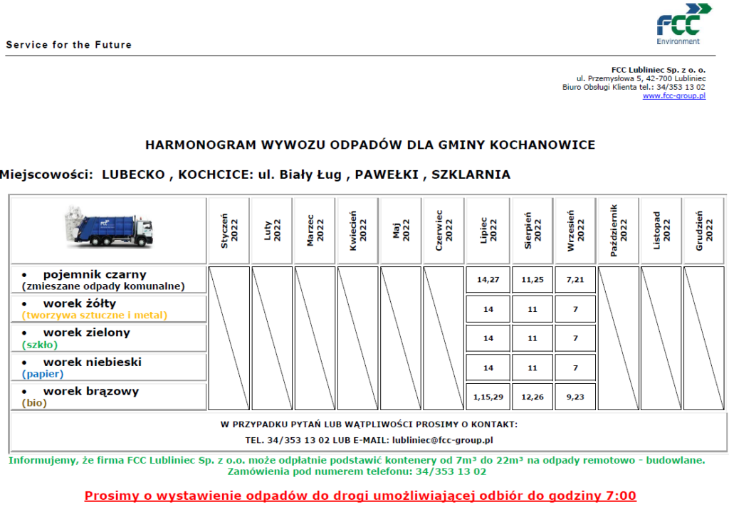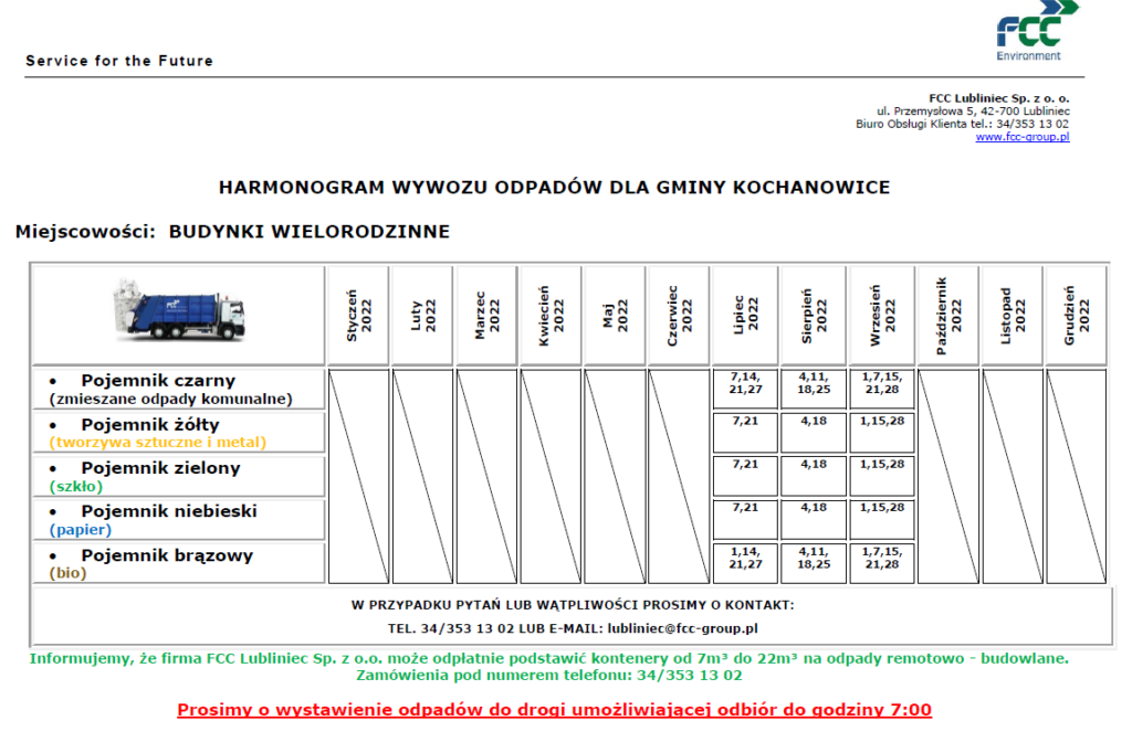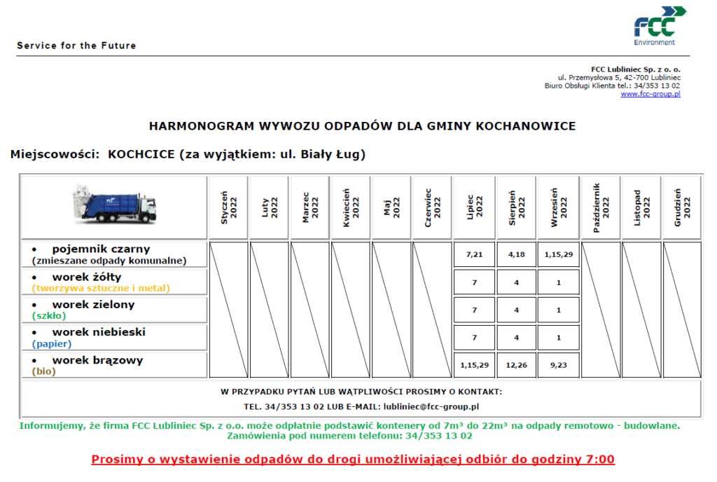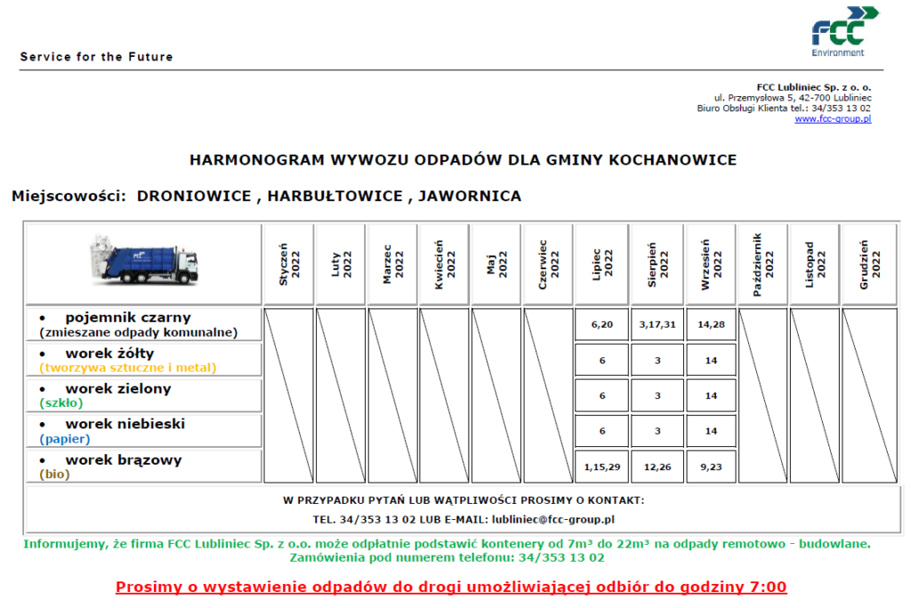 Harmonogram odbioru odpadów w okresie lipiec – wrzesień 2022 r.