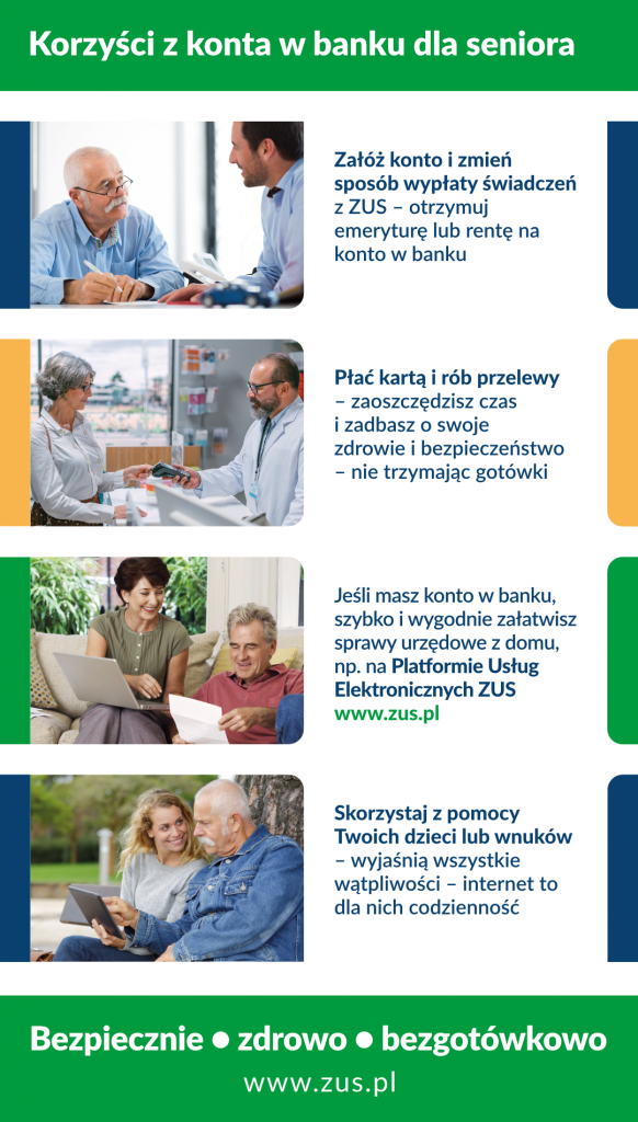 Jeśli już założą konto w banku, również przez internet, w prosty sposób mogą zgłosić w ZUS, że chcą zmienić sposób wypłaty świadczeń – właśnie na konto w banku. W ten sposób zawsze bezpiecznie i zawsze na czas otrzymają swoją emeryturę lub rentę. Nie będą musieli co miesiąc czekać na listonosza lub iść osobiście na pocztę i narażać swoje zdrowie podczas kontaktu z innymi ludźmi podczas epidemii czy sezonu grypowego. Dzięki rachunkowi w banku będą mogli również załatwić wiele spraw urzędowych, nie wychodząc z domu.
