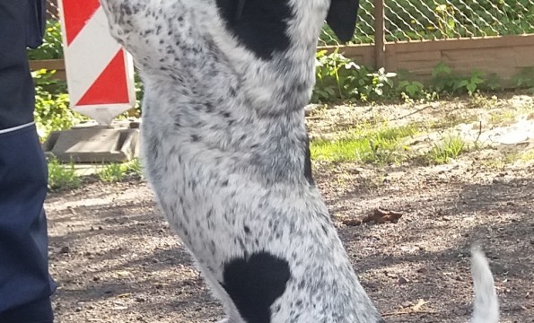 Pies jest średniej wielkości w wieku ok. 4-5 lat, krótkiej sierści, maści popielatej w czarne łatki, zawsze radosny i chętny do zabaw.