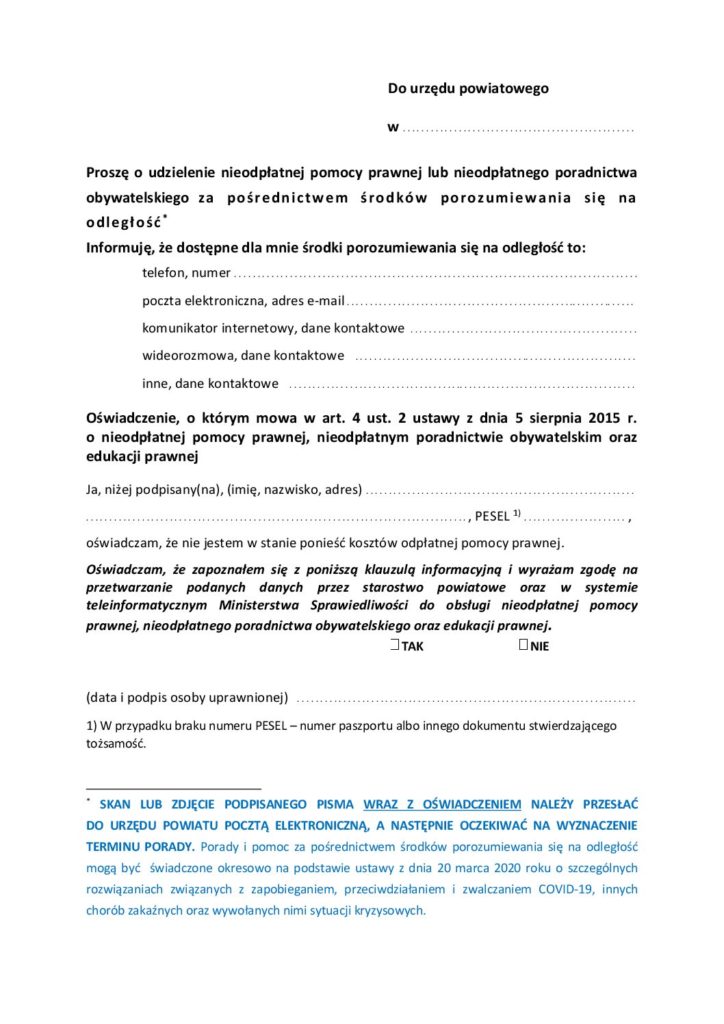 W celu skorzystania z porady telefonicznej lub mailowej należy pobrać zgłoszenie porady na odległość (załącznik), wypełnić i osobiście podpisać. Skan zgłoszenia należy przesłać do wybranego prawnika, przypisanego do Państwa gminy.