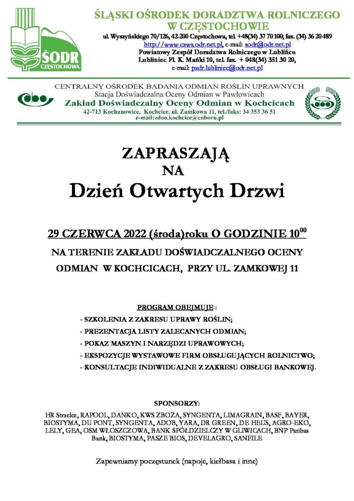 Śląski Ośrodek Doradztwa Rolniczego w Częstochowie, Centralny Ośrodek Badania Odmian Roślin Uprawnych Stacja Doświadczalna Oceny Odmian w Pawłowicach oraz Okręgowa Spółdzielnia Mleczarska we Włoszczowie zapraszają na Dzień Otwartych Drzwi, który odbędzie się 29 czerwca 2022 r. o godz. 10:00 na terenie Zakładu Doświadczalnego Oceny Odmian w Kochcicach przy ul. Zamkowej 11.
